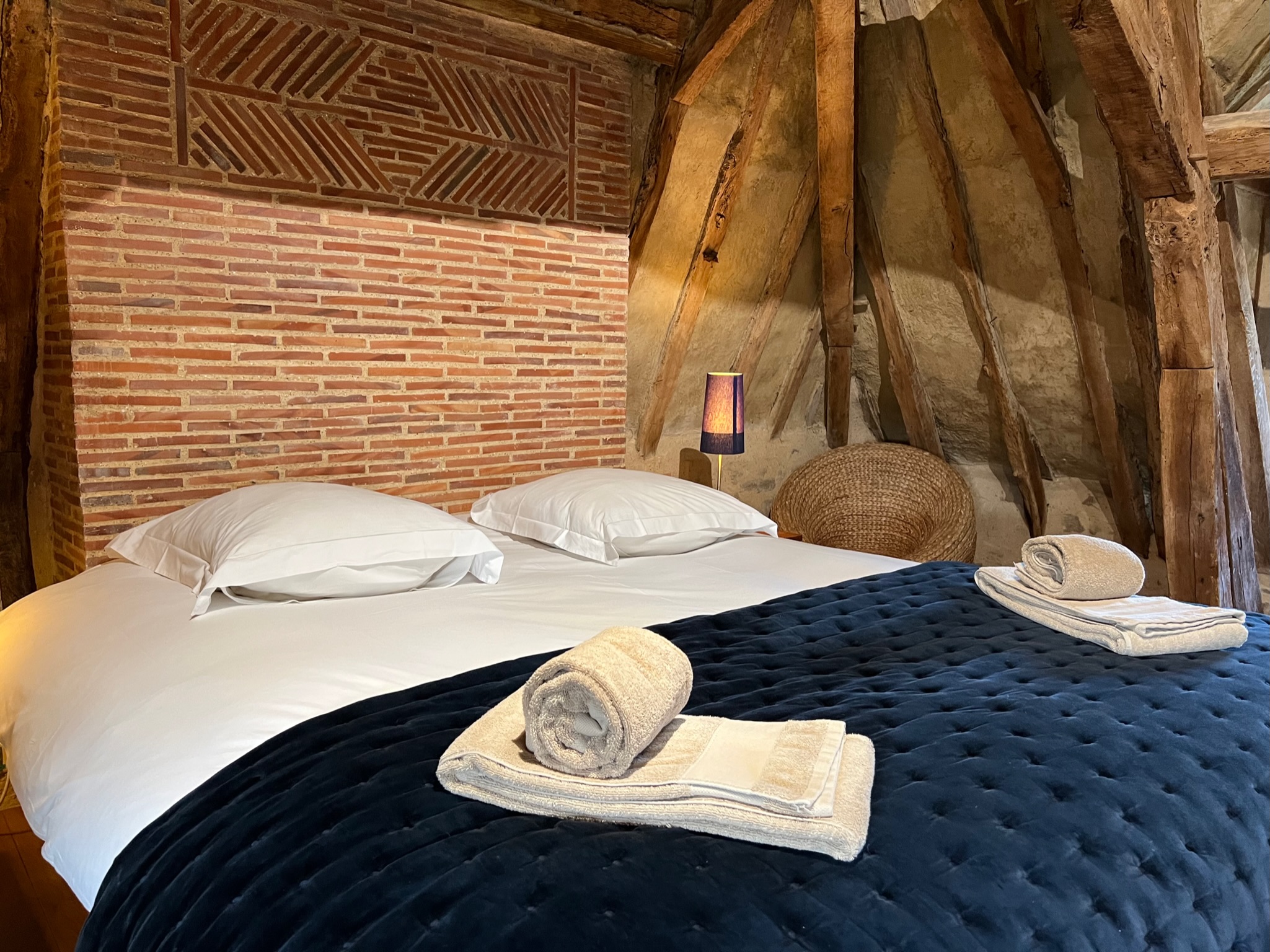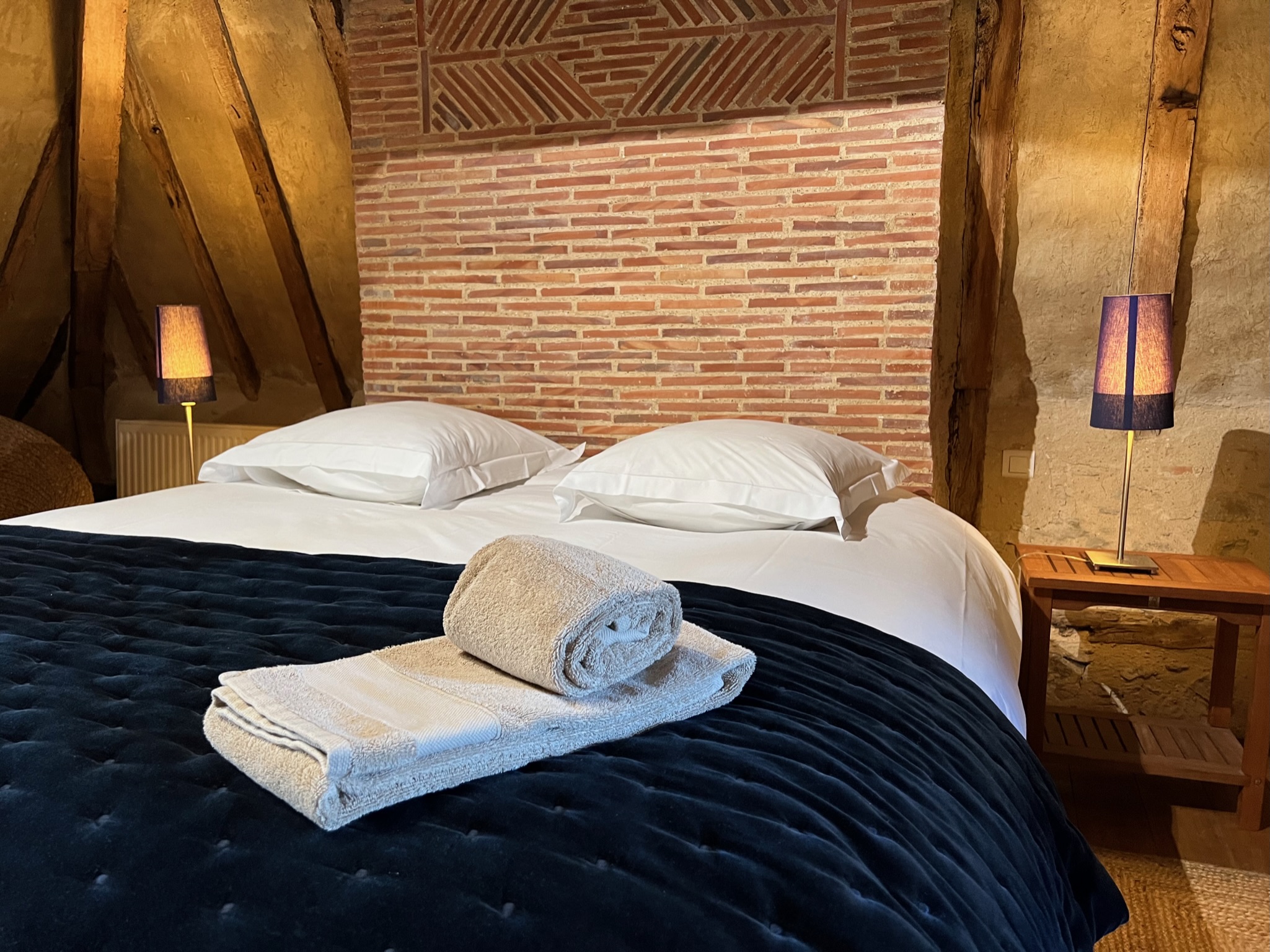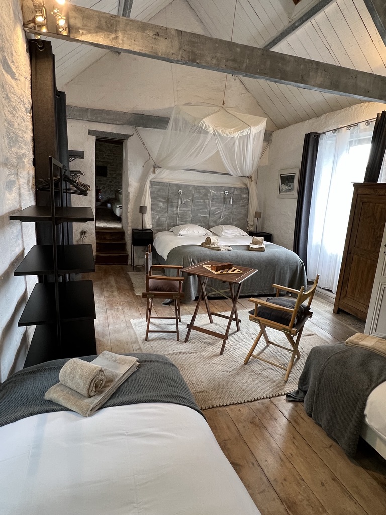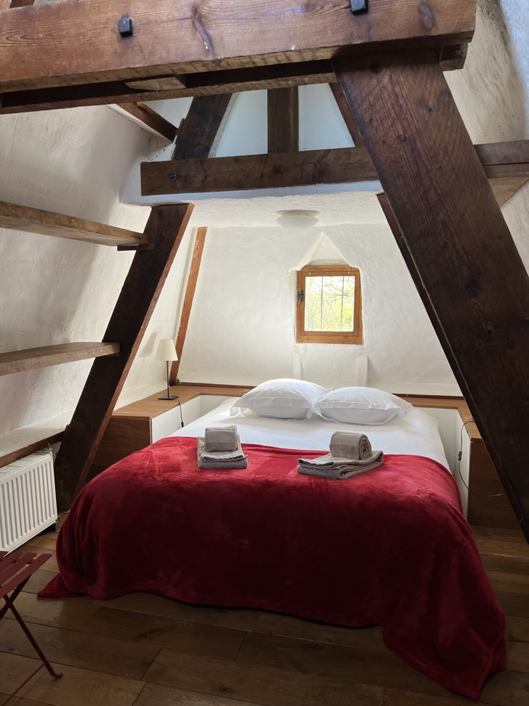 - 1 petite chambre supplémentaire en haut de la tour du manoir ; avec 2 lits singles ou 1 lit double. Attention, accès par marches hautes et raides.