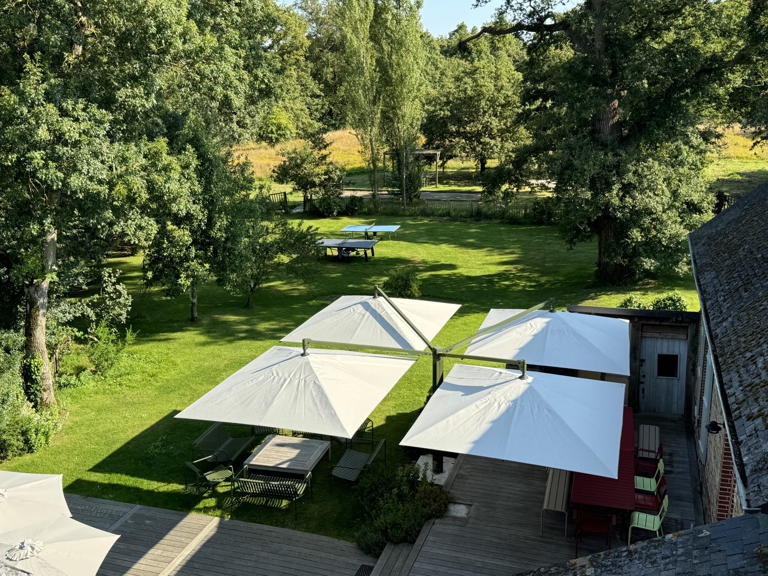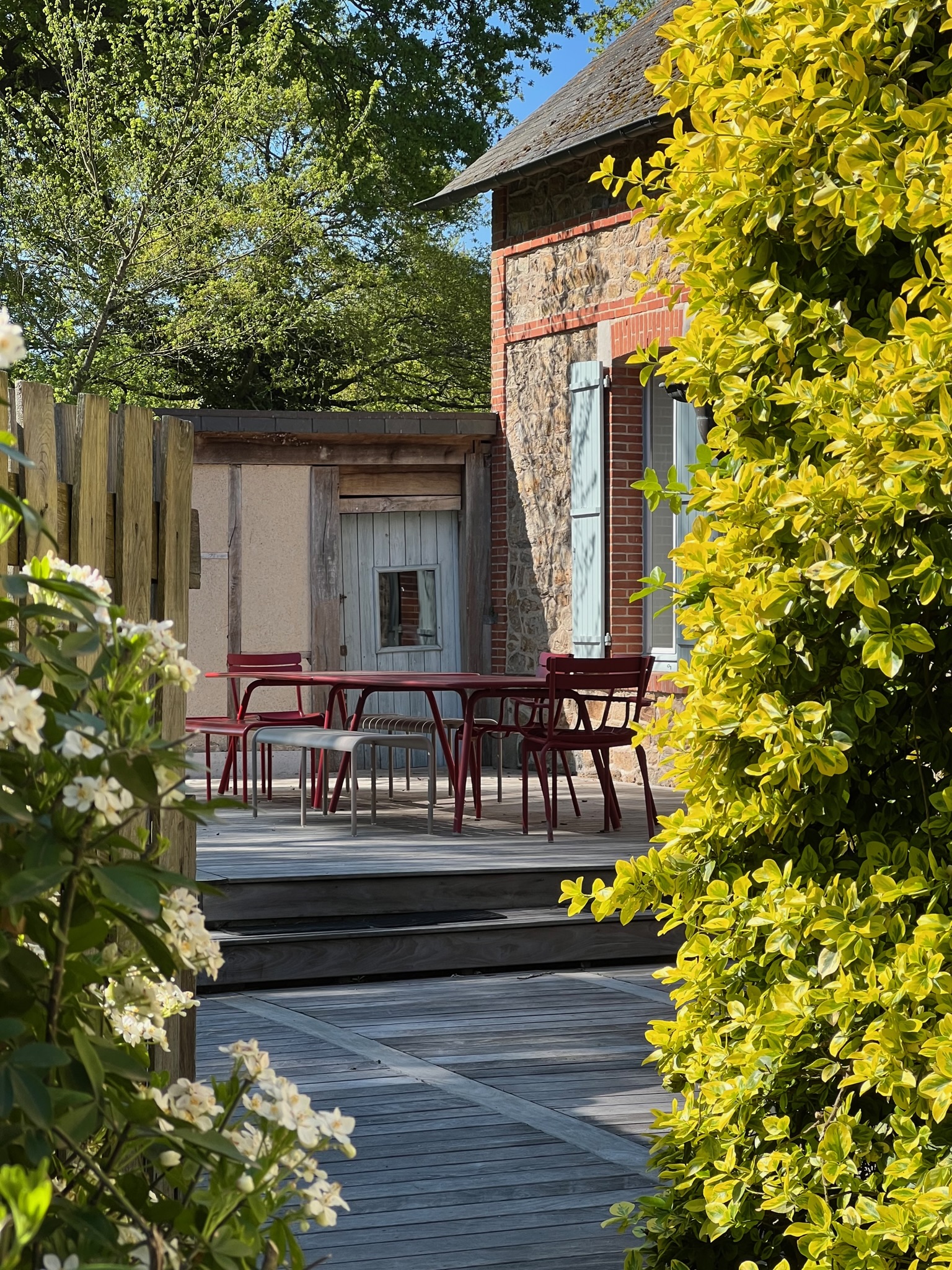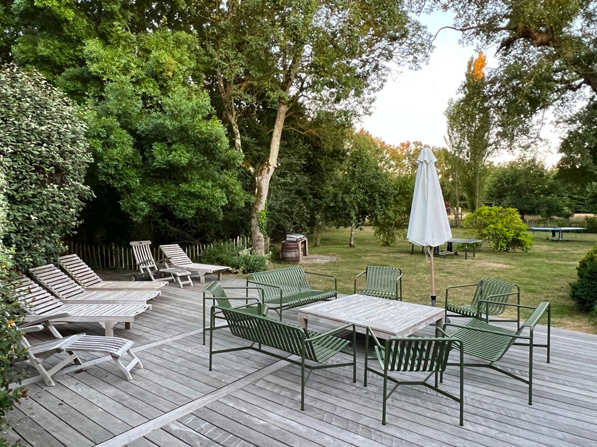 Les nombreuses terrasses aux beaux jours : côté piscine la terrasse en bois d’Ipé 100m2, plusieurs terrasses en granit côté manoir…