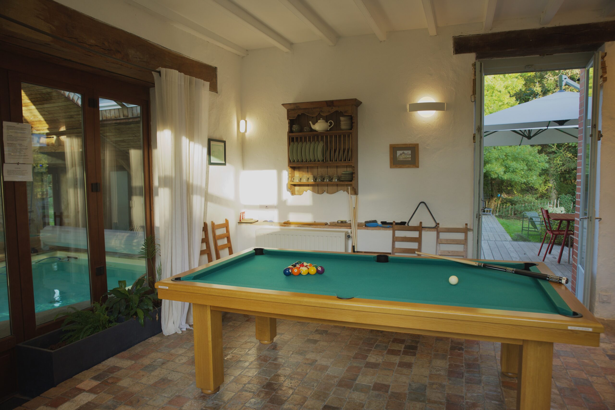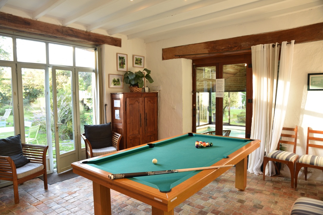 La pièce commune du cottage (25m2) : Billard Américain/français transformable en table de travail pour 10 personnes, vue sur les jardins et la piscine intérieure. Murs blanchis à la chaux, tommettes aux sols.