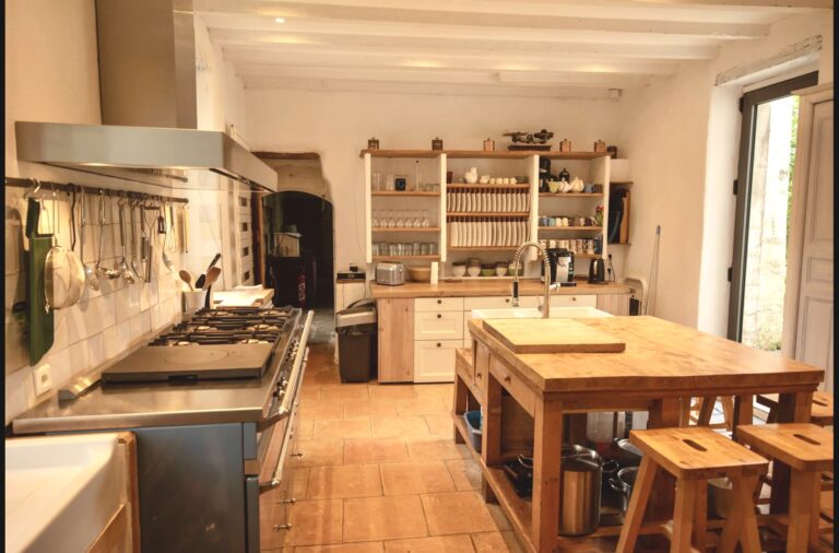 - La cuisine avec îlot et cuisinière gastronomique qui sert comme lieu convivial notamment pour des ateliers cuisine.