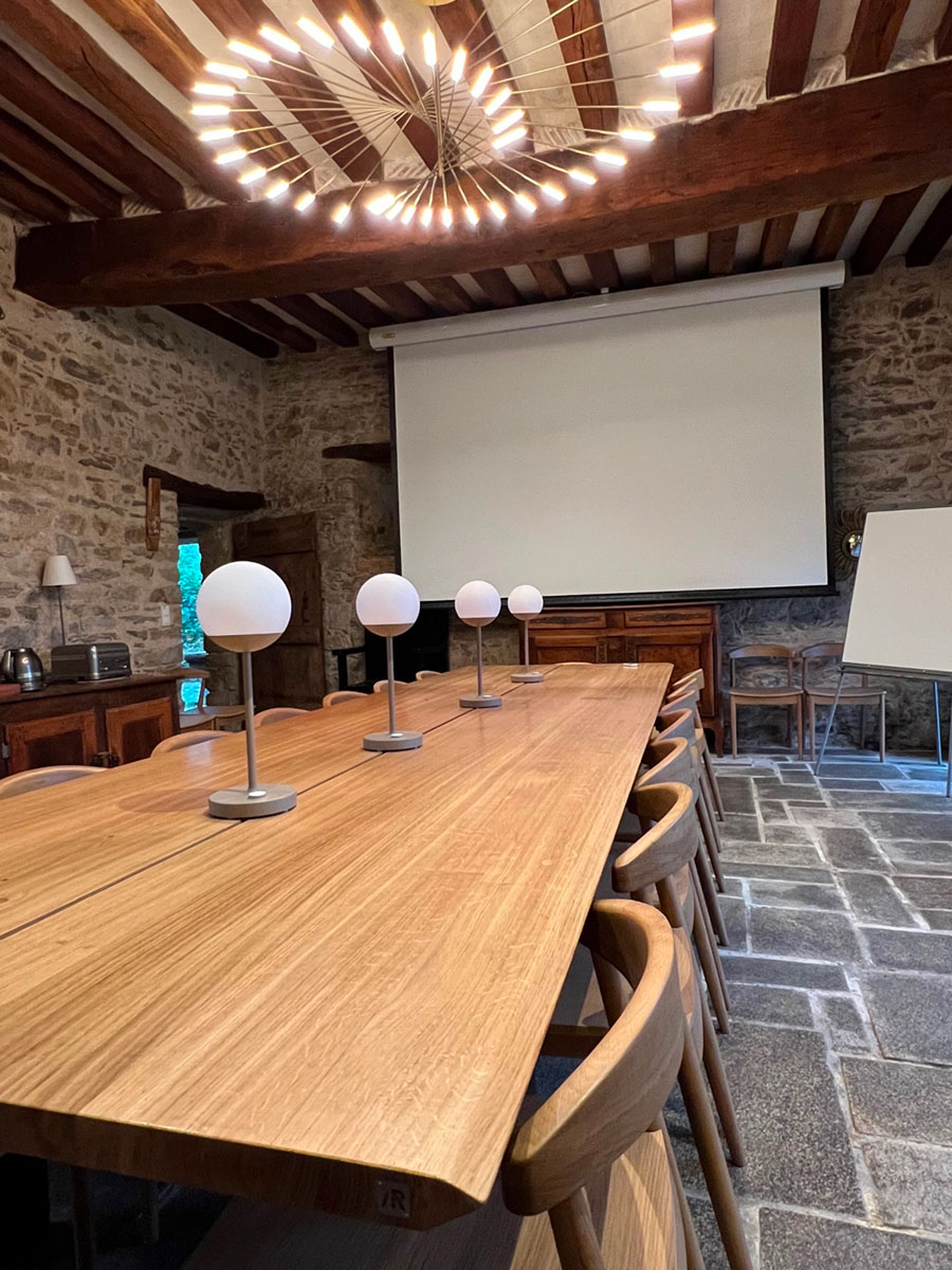 La salle à manger du manoir (40m2) : La pièce maîtresse du manoir. Grande table en chêne 3m80 pouvant accueillir au maximum 20 personnes, vidéo projecteur, écran (largeur 3m), cheminée avec poêle à bois, poutres en chêne, sol en granit…