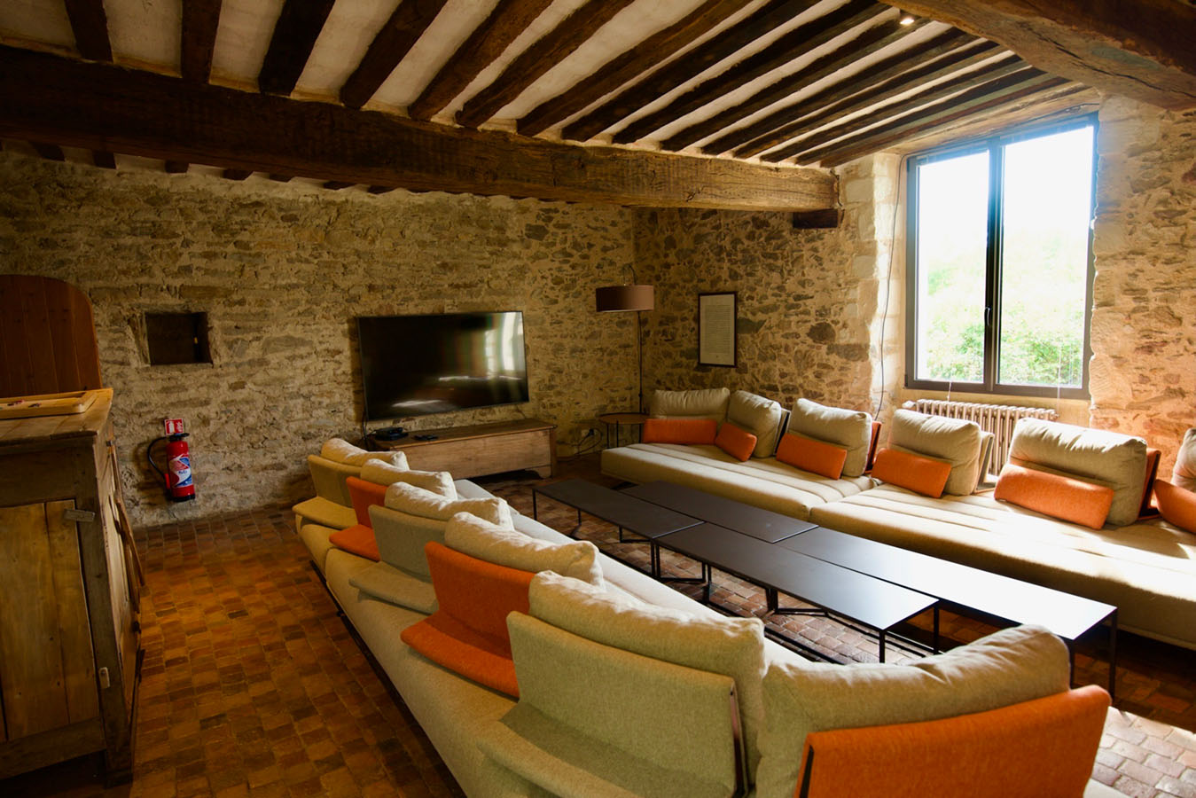 Le salon à l’étage du manoir (40m2) : propice au travail en groupes/ateliers. Disposition assise modulable. Une grande télévision à disposition.